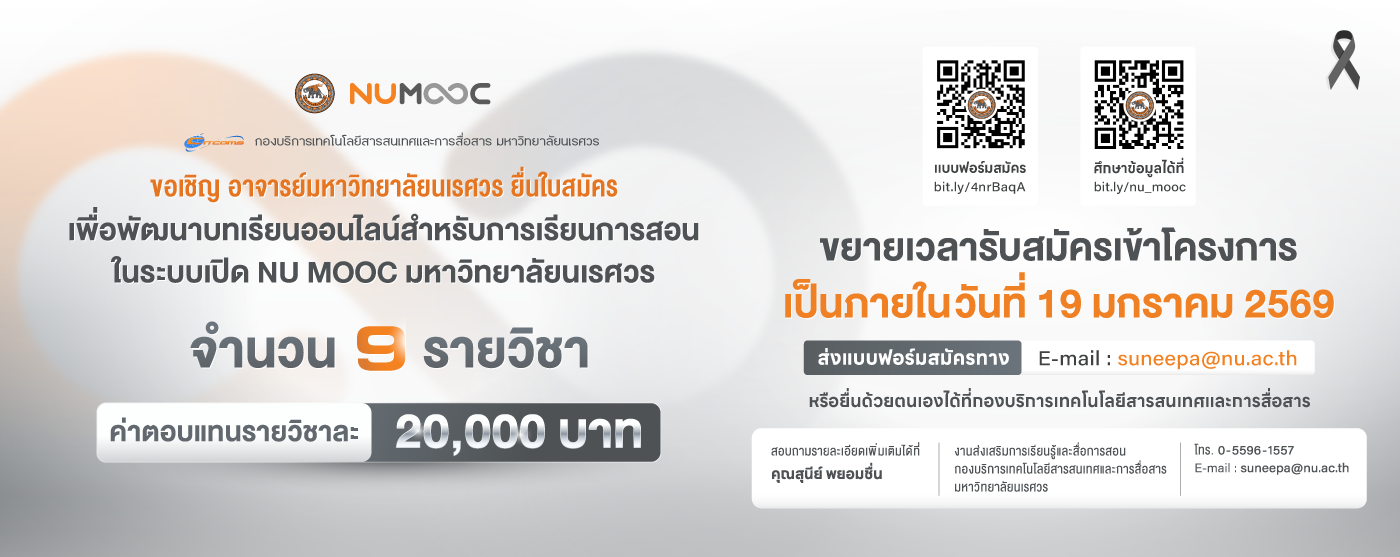 เว็บไซต์ มหาวิทยาลัยนเรศวร ใช้คุกกี้เพื่อเพิ่มประสิทธิภาพและประสบการณ์ที่ดีในการใช้เว็บไซต์ท่านสามารถศึกษารายละเอียดการใช้คุกกี้ได้ที่"นโยบายการใช้คุกกี้" และ นโยบายการคุ้มครองข้อมูลส่วนบุคคล
