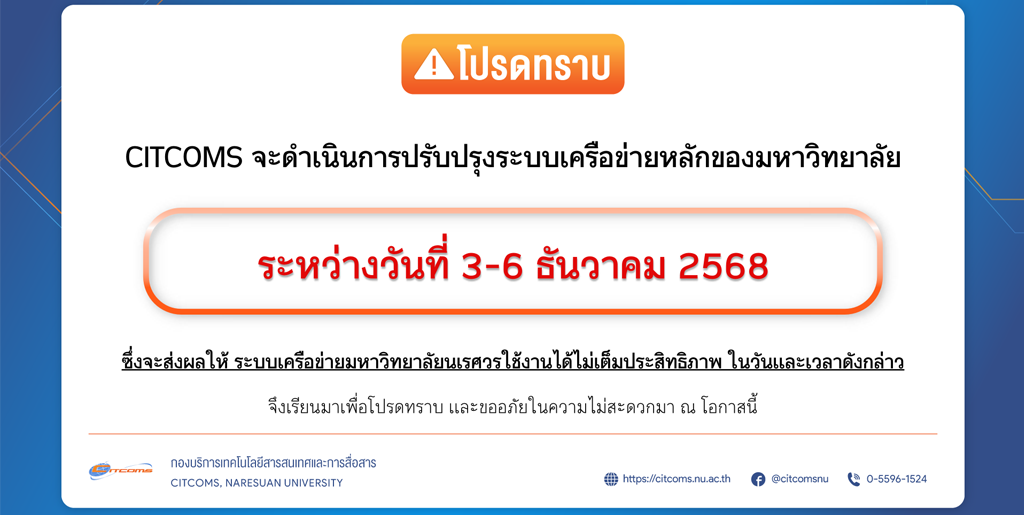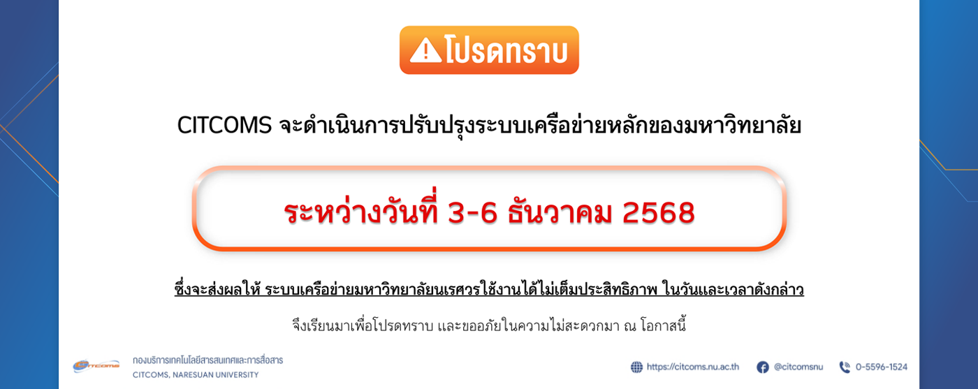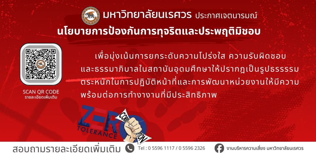 เว็บไซต์ มหาวิทยาลัยนเรศวร ใช้คุกกี้เพื่อเพิ่มประสิทธิภาพและประสบการณ์ที่ดีในการใช้เว็บไซต์ท่านสามารถศึกษารายละเอียดการใช้คุกกี้ได้ที่"นโยบายการใช้คุกกี้" และ นโยบายการคุ้มครองข้อมูลส่วนบุคคล