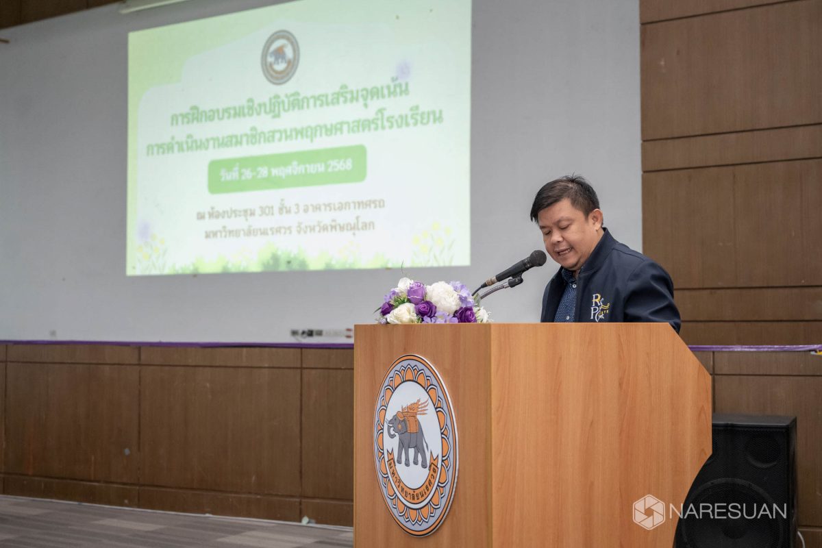 เมื่อวันที่ 26 พฤศจิกายน 2568 ผศ.ดร.จรูญ สารินทร์ รองอธิการบดีฝ่ายกิจการพิเศษ มหาวิทยาลัยนเรศวร เป็นประธานกล่าวต้อนรับและกล่าวเปิด การอบรมเชิงปฏิบัติการเสริมจุดเน้นการดำเนินงานสมาชิกสวนพฤกษศาสตร์โรงเรียน โดยมี ผศ.ศิษฐ์ภัณฑ์ แคนลา รักษาการในตำแหน่งผู้อำนวยการกองส่งเสริมการบริการวิชาการ เป็นผู้กล่าวรายงาน